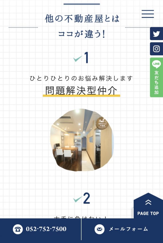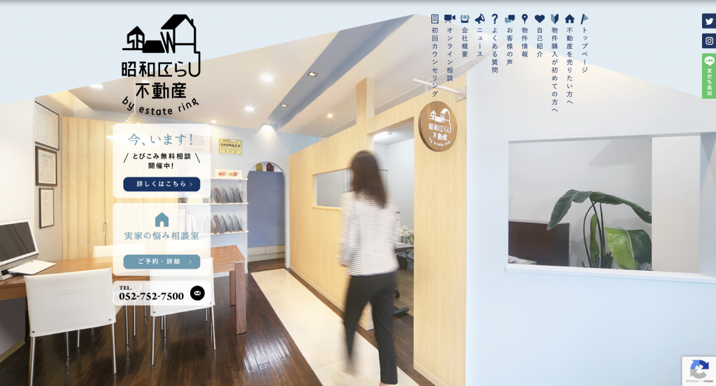 名古屋市昭和区にある、街の不動産屋らしい親しみやすさと機能性を両立させた、地域密着型の不動産ホームページの事例です。