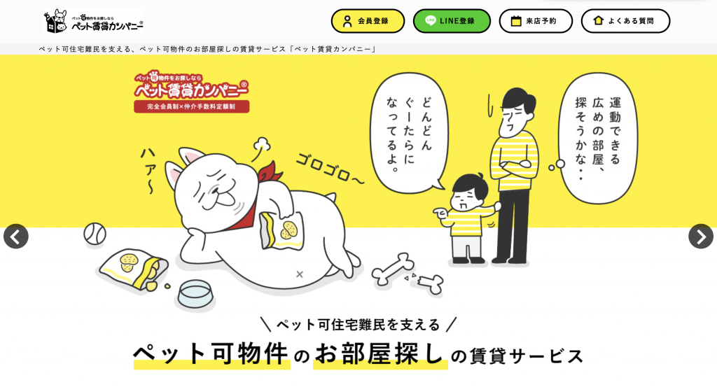 ペット同伴の賃貸・売買物件を探すユーザー向けに設計され、物件検索機能とペットライフ支援コンテンツを融合させた「ペットファースト」の構成が際立っています。