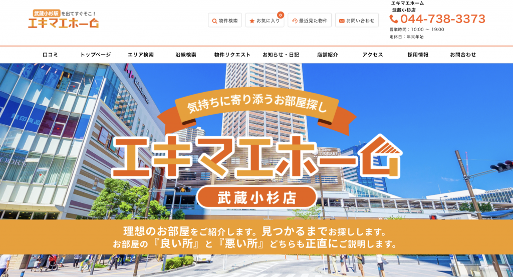 地域密着を強く打ち出した不動産会社サイトで、とくに「川崎・武蔵小杉エリア」の不動産に特化した情報提供と信頼訴求が印象的です。